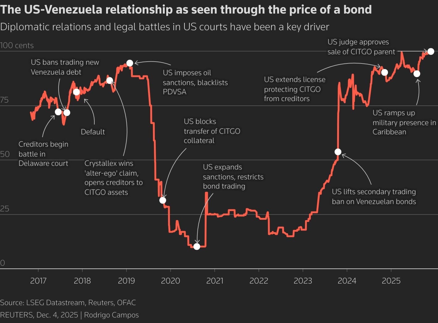 The market’s reaction to these developments, compounded by shifting US foreign policy, has been nothing short of historic. In mid-2020, amidst the height of the debt crisis and sanctions, the bond traded as low as 10 cents on the dollar. However, the confirmation that the debt was enforceable under New York law provided the first catalyst for a repricing.