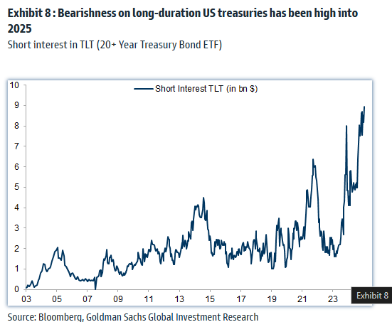 Goldman Sachs has reported that short interest in TLT is near century-highs, painting a picture of a market betting heavily against long-term Treasury bonds. This sentiment is not just a reflection of pessimism about bond prices but also an indicator of how investors might be positioning themselves for a yield curve steepening or even an inversion scenario. However, this contrarian position could backfire spectacularly if the market moves in the opposite direction, signaling a bond rally.